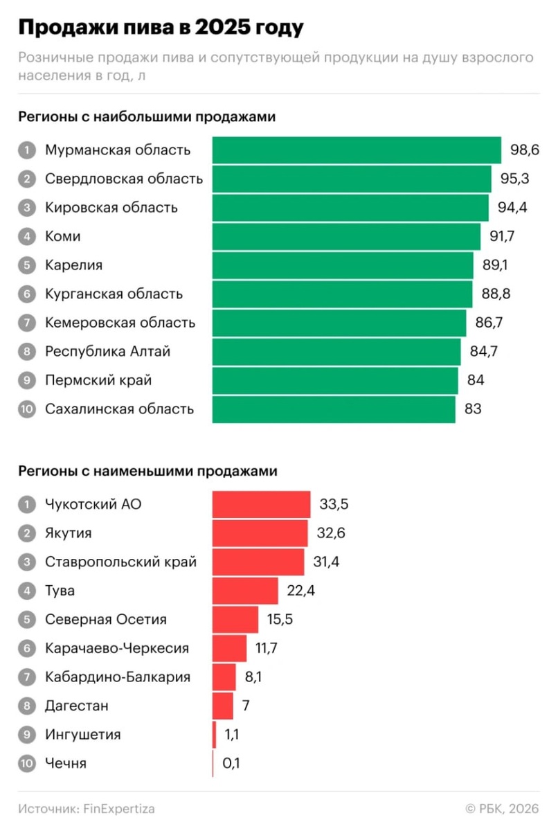 В 2025 году регион обогнала лишь Мурманская область — 98,6 проданных литра в год на душу населения против 95,3 свердловских. Из регионов УрФО в топ-10 попала и Курганская область — 88,8 литров на душу населения и 6 место в рейтинге. При этом средний уровень продажи пива по стране составляет 60,4 литра на человека. Пивозавры тут?😆