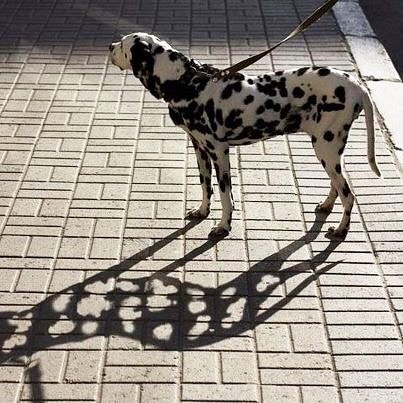 Посмотрите на тень собаки. Черные пятна на ее шерсти почему-то пропускают свет, словно это прозрачные окна на ее теле.