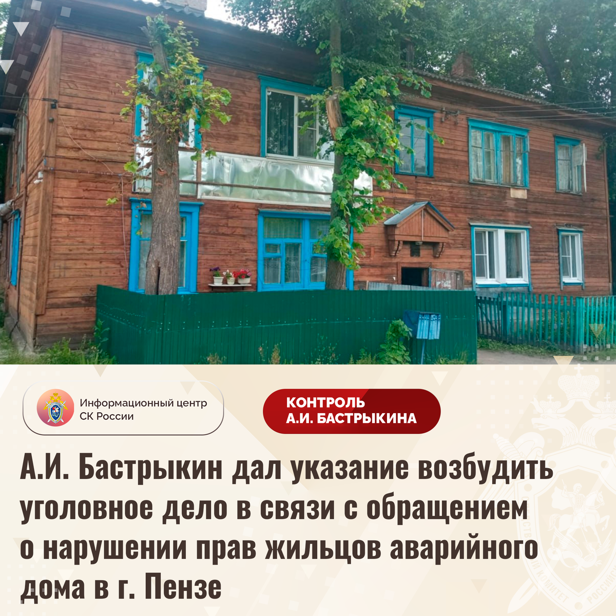 А.И. Бастрыкин дал указание возбудить уголовное дело в связи с обращением о нарушении прав жильцов аварийного дома в г. Пензе В приемную Председателя СК России А.И. Бастрыкина в социальной сети «ВКонтакте» поступило обращение по вопросу нерасселения жильцов многоквартирного дома на улице Индустриальной города Пензы. Длительное время здание барачного типа 1952 года постройки находится в непригодном состоянии: конструкции разрушаются, целостность кровли нарушена, из-за чего жилые помещения затапливаются, неисправно печное отопление. В 2017 году строение ввиду высокой степени физического износа конструкций признано аварийным, однако в установленные на 2024 год сроки расселения благоустроенное жилье гражданам не предоставлено. Обращения в различные инстанции результатов не принесли. В СУ СК России по Пензенской области организована процессуальная проверка. Председатель Следственного комитета Российской Федерации Александр Иванович Бастрыкин дал указание руководителю СУ СК России по Пензен
