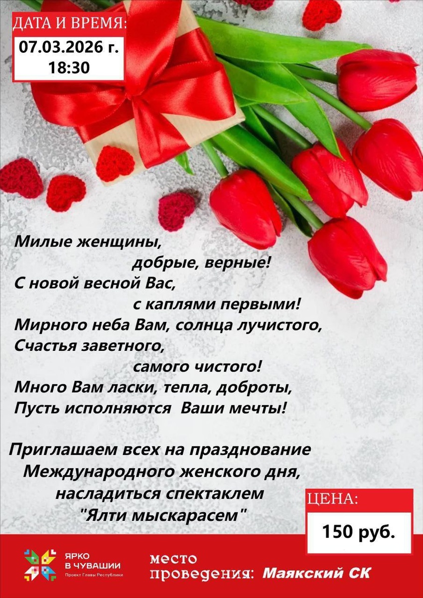 " Дата: 7 марта в 18:30 Хисепле туссем, юлташсем💞Сире, пуш уйӑхӗн 7 мӗшӗнче 18 сехет те 30 минутра Маяк ял клубне "Ялти мыскара" спектакль курма йыхравлатпӑр. Пурне те кӗтетпӗр👉❤️