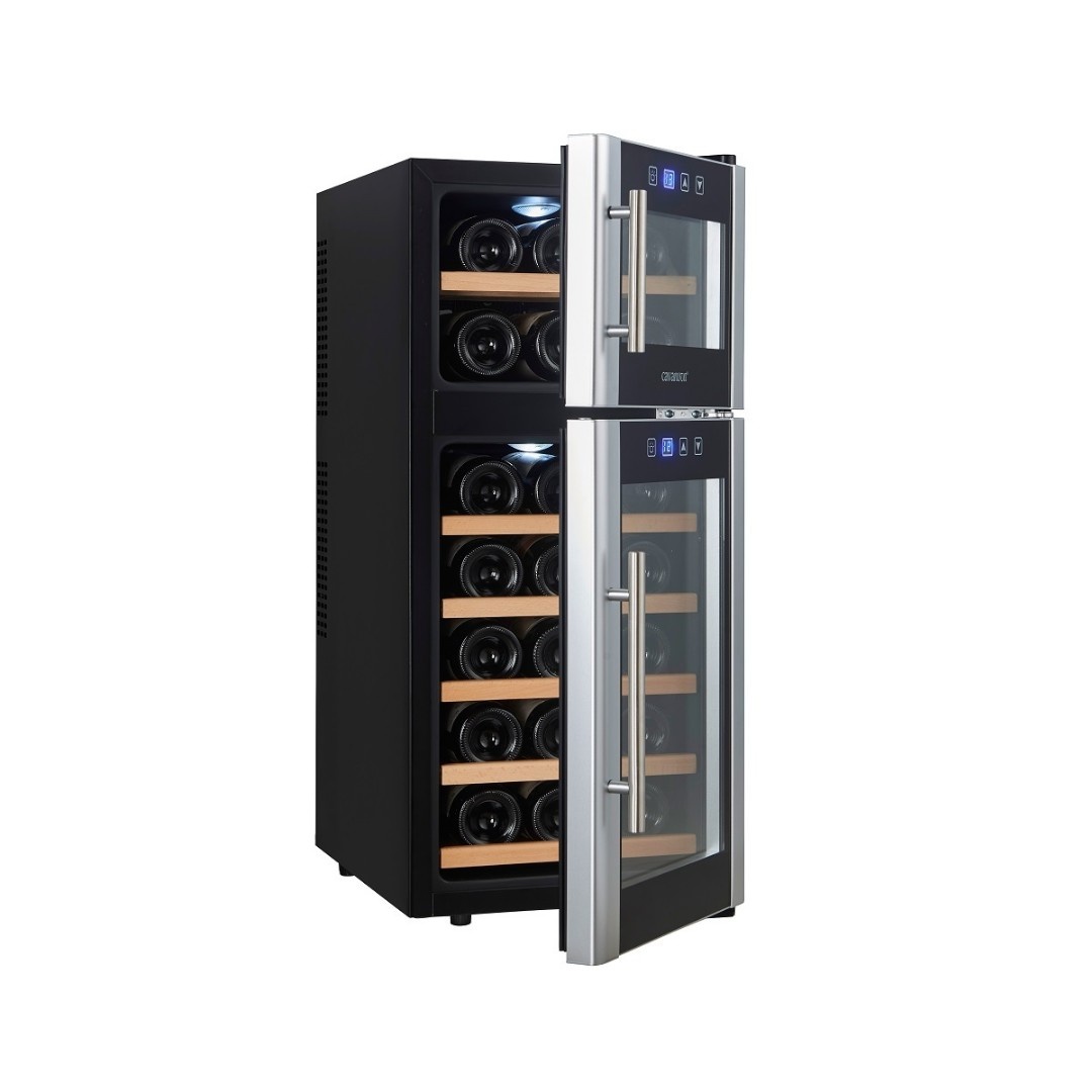 А теперь представьте противоположность: тихий, стабильный микроклимат, где вино дышит и развивается, как в настоящем винном погребе. Именно это дает Cavanova CV021-2TNS. Температура от +7 до +18 °C в одной зоне и от +10 до +18 °C во второй — идеально для белого, розового и красного одновременно. Красное любит потеплее, белое — прохладнее. Две камеры с отдельным управлением позволяют хранить всё правильно, не жертвуя ничем.