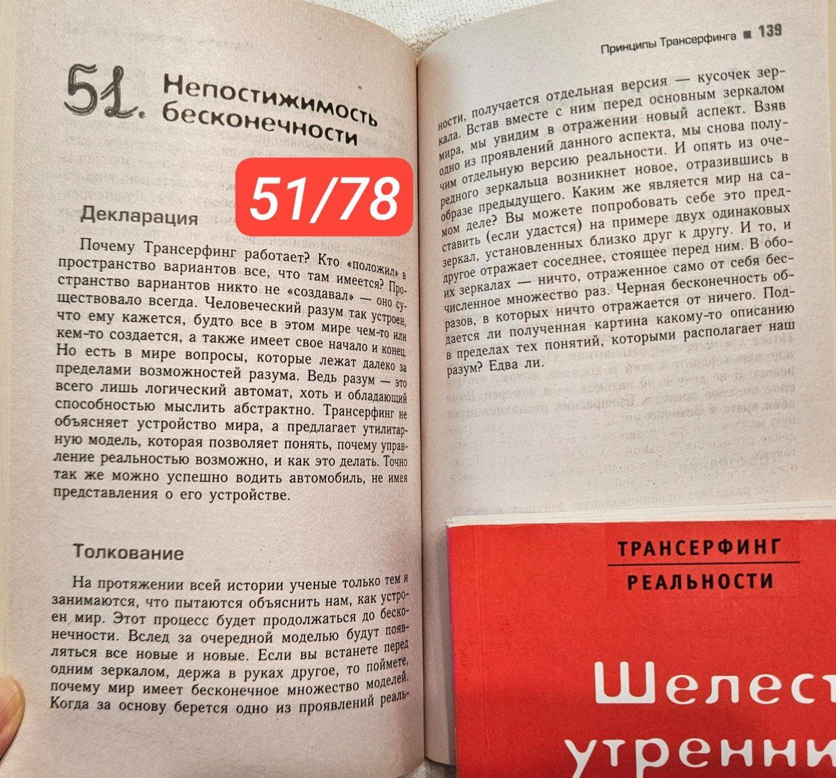 51/78 Практикум управления реальностью - Трансерфинг Непостижимость бесконечности "Есть в мире вопросы, которые лежат далеко за пределами возможностей разума. Ведь разум - это всего лишь логический автомат, хоть и обладающий способностью мыслить абстрактно." "Трансерфинг не объясняет устройство мира, а предлагает утилитарную модель, которая позволяет понять, почему управление реальностью возможно, и как это делать. Точно также можно успешно водить автомобиль, не имея представления о его устройстве." "На протяжении всей истории ученые только тем и занимаются, что пытаются объяснить нам, как устроен мир. Этот процесс будет продолжаться до бесконечности. Вслед за одной моделью будут появляться все новые и новые. Если вы встанете перед зеркалом держа в руках другое, то поймете, почему мир имеет бесконечное множество моделей. Когда за основу берется одно из проявлений реальности, получается отдельная версия - кусочек зеркала. Встав вместе с ним перед основным зеркалом мира, мы увидим в
