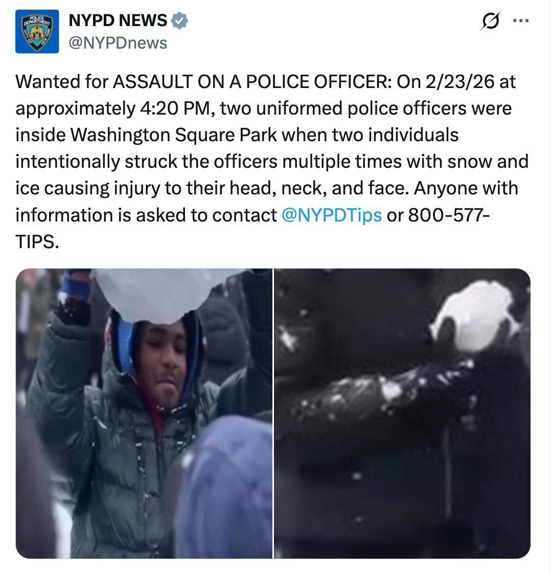 The NYPD is looking for the identity of individuals who ‘intentionally’ threw huge chunks of snow at the heads of two officers