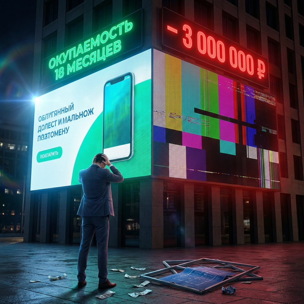 Это инструмент продаж. Но вот факт, который вам не скажет 80% рынка: Большинство экранов покупаются неправильно. И через 12–24 месяца владелец начинает платить второй раз. Я покажу, где именно бизнес теряет миллионы. Самый опасный вопрос, который задаёт клиент: «Сколько стоит квадратный метр?» LED-экран — это не плитка и не гипсокартон. Два экрана одинакового размера могут отличаться по себестоимости на 25–40%. Почему? Потому что внутри: Экономия 600 000 ₽ на старте
