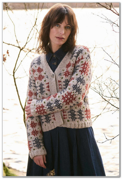 Кардиган — это стильная модель с жаккардовым узором от известного дизайнера Лизы Ричардсон, созданная специально для коллекции Rowan Felted Tweed Soft.