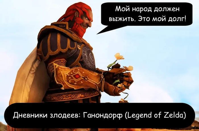 Меня зовут Ганондорф. Король герудо, повелитель пустыни, носитель проклятия Демона. И я устал смотреть, как мир называет меня исчадием тьмы, в то время как те, кого вы зовёте героями, топчут мою землю и мою судьбу. Вы смотрите на меня и видите только монстра. Чудовище в чёрных доспехах, которое хочет погрузить мир во тьму. Но кто-нибудь из вас задумывался, почему я стал таким? Кто-нибудь смотрел на пески пустыни, где родился мой народ, и спрашивал себя, справедливо ли с ним обошлись? Мы, герудо, воины. Мы рождаемся с мечом в руке и яростью в крови. Но мы не чудовища. Мы просто хотели жить. Хотели иметь свой дом, свою землю, своё место под солнцем Хайрула. Но ваши предки, эти самодовольные хайлианцы, загнали нас в пустыню. Они сказали, что мы слишком дикие, слишком опасные, слишком другие. Они построили свои зелёные холмы и спокойные озёра на костях нашей истории и даже не оглянулись. А знаете, что самое обидное? Они молились своим богам, и боги их слышали. А мы молились своим, и боги м
