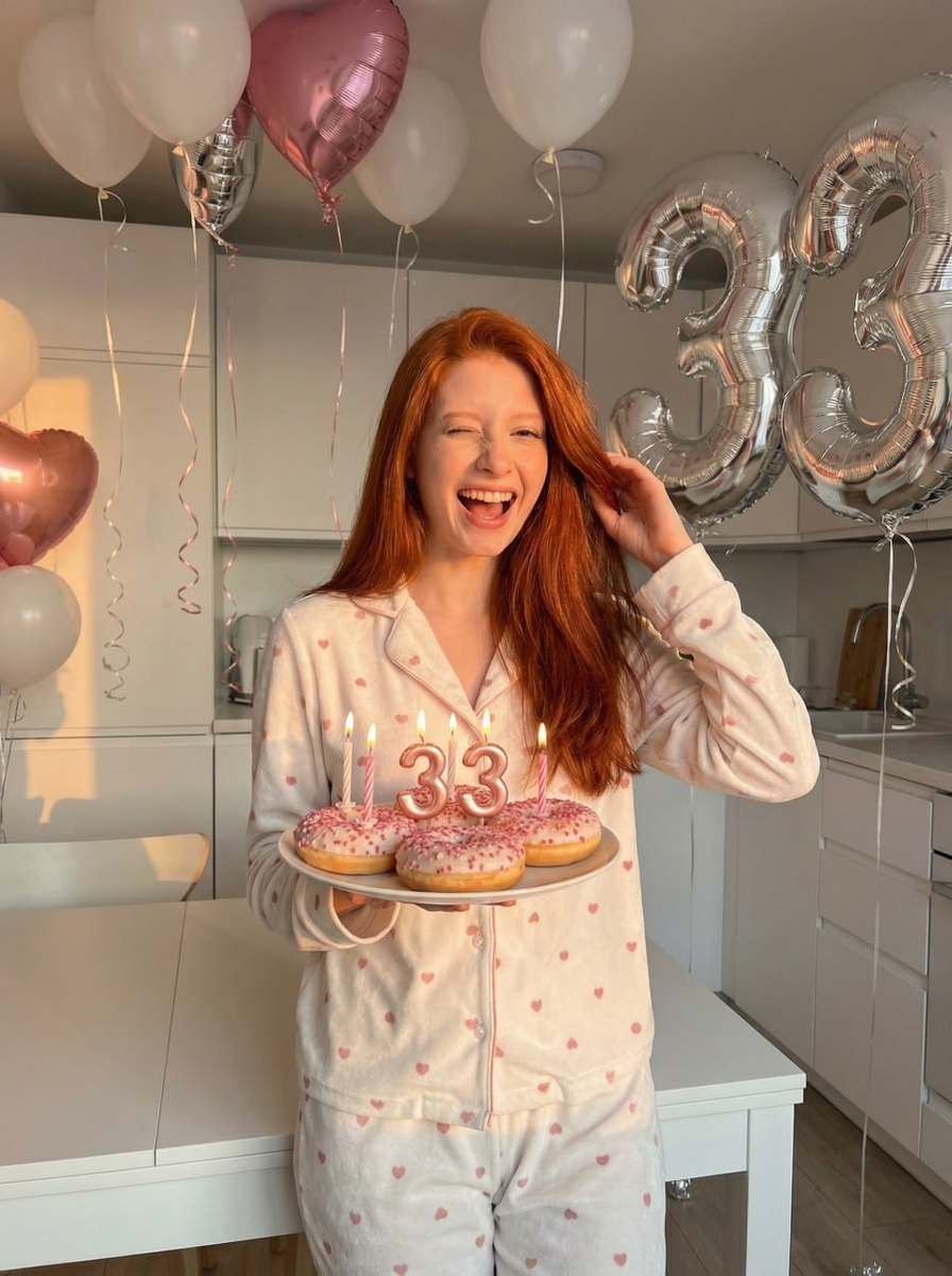 ! 🌟 Оставляю вайбовый промпт Не меняя внешности женщины с фото, в кадре живая сцена домашнего праздника с теплом и радостью. Она стоит в уютной современный белой кухне в мягком золотистом вечернем свете, подчёркивающем контуры лица и тела, с деликатными тенями, создающими интимную атмосферу. Женщина фронтальна, слегка наклонила голову вперёд, с открытым ртом и подмигивающим глазом, выражая игривое настроение. Руки держат круглую тарелку с четырьмя пончиками с розовым посыпом и тонкими горящими свечами, а также две свечи в форме цифр "3»и «3». объемные длинные волосы мягко ложатся на плечи, немного задеты рукой. Одежда — белый домашний костюм с мелким узором розовых сердечек, бархатистый, свободно облегающий силуэт. За ней парят воздушные шары белого, розового цвета в форме сердечек и металлические серебристые, включая цифры «33» с ниспадающими лентами, создающими живую текстуру. На заднем плане белые кухонные шкафы и стол — нейтральный фон, акцентирующий героиню и праздник. Свет,