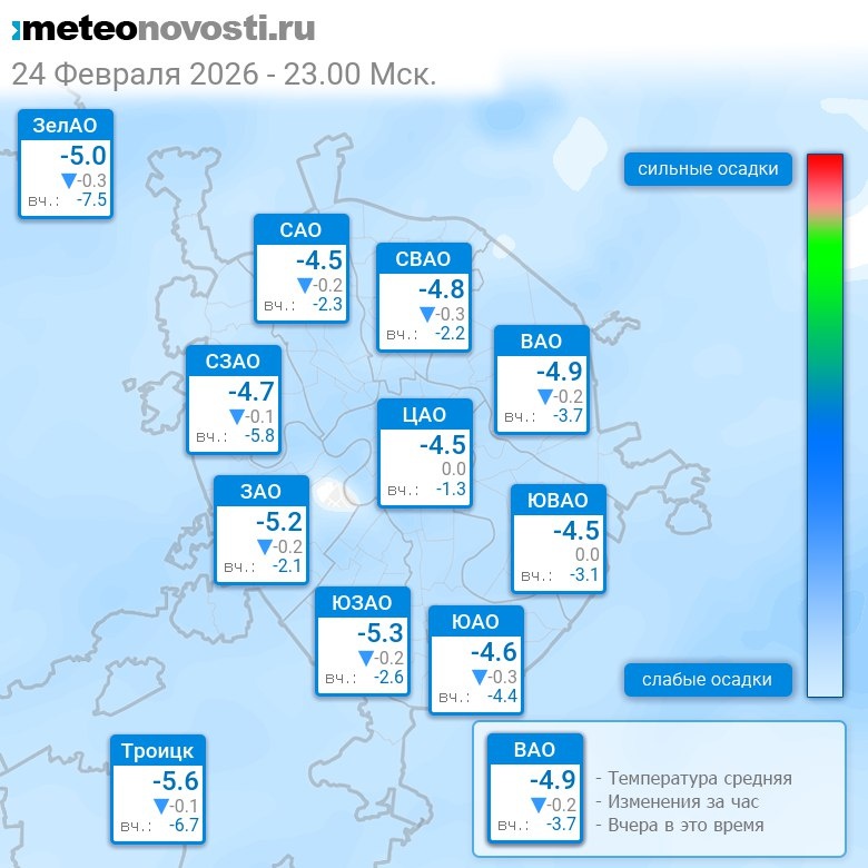 В 23:00 в Москве было от -5.8°C до -3.5°C, средняя температура -4.7°C #погода #Москва #зима #температура #24февраля #вторник