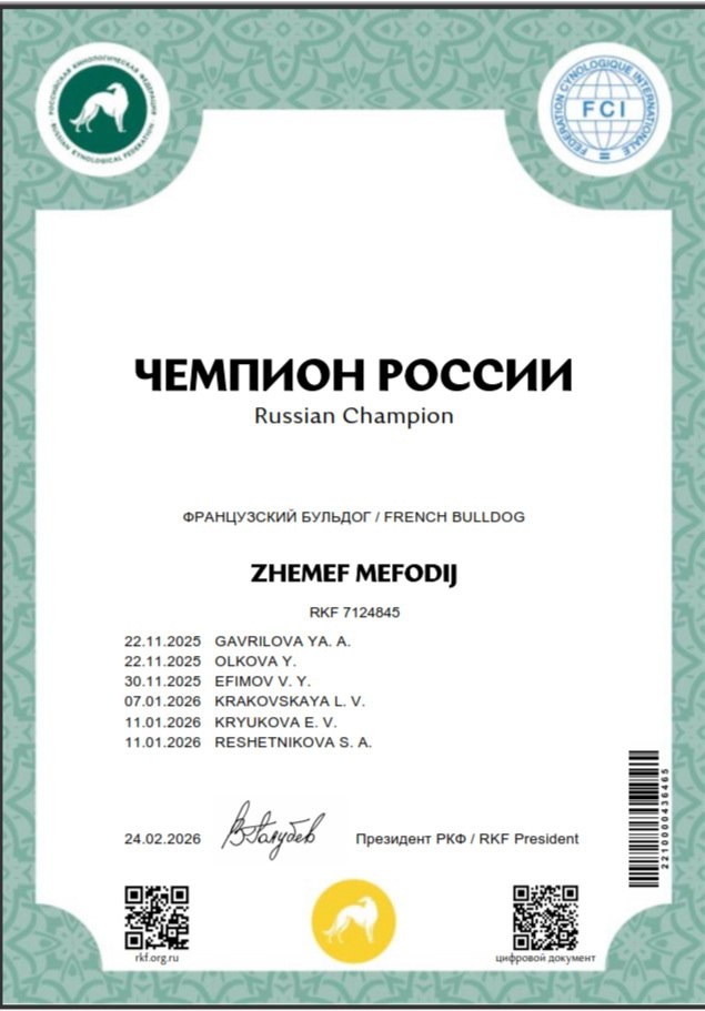 ЖЕМЕФ МЕФОДИЙ (о. ЖЕМЕФ ЕРОФЕЙ & м. ЖЕМЕФ КАПИТАЛИНА) Сегодня наш Мефодий (Жемеф Мефодий) получил официальный документ Чемпиона России. PS* В правом нижнем углу при наведении на штрих код подтверждается подлинность документа на сайте РКФ.