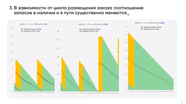 Чем длиннее цикл заказа, тем больше мы вынуждены держать «циклических запасов» — потому что страхуемся до следующего окна размещения заказа.