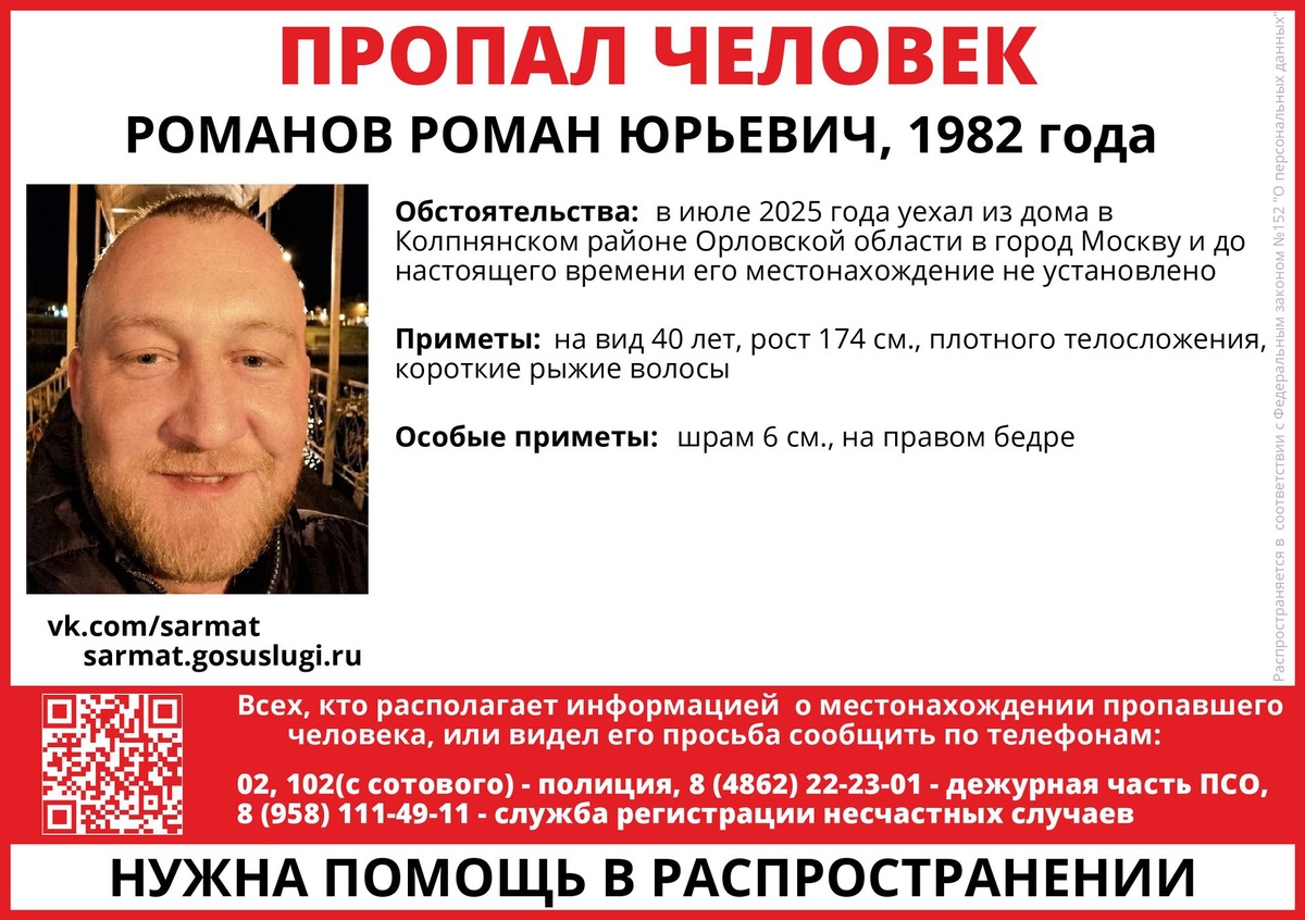 В июле 2025 года он уехал из дома в Колпнянском районе Орловской области в город Москву и до настоящего времени его местонахождение не установлено. 📏 Приметы: на вид 40 лет, рост 174 см, плотного телосложения, короткие рыжие волосы, шрам 6 см на правом бедре. Если вы располагаете какими-либо сведениями о местонахождении пропавшего, просим сообщить по телефонам: 8 (4862) 22-23-01 - дежурная часть поисково-спасательного отряда "Сармат", 02, 102 или 8 (4862) 43-32-32 - полиция.