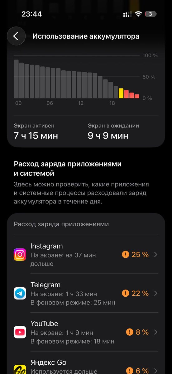 ⚡️Автономность iOS 26.4 Beta 2 Снял с зарядки в 21:35 и активно пользовался до 08:00 утра, а потом с 15:00. В итоге в 23:44 остается 3%. По условиям все стандартно для меня: LTE на двух симках, вайфай/сотовая сеть 50/50 по времени. Яркость 50%. Как обычно соцсети, браузер, ютуб, навигация. Айфон 17 Про, емкость аккума 100%. Always On и 120гц включены. В итоге около 9 часов экрана. Чуть получше чем на прошлой бете. Как у вас?🤔