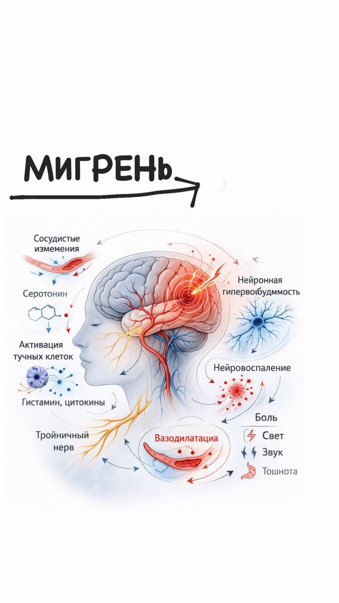 , как в организме взаимосвязаны сосудистые, нейронные, иммунные и гормональные механизмы. Классические проявления мигрени включают головную боль продолжительностью от 4 до 72 часов, выраженную чувствительность к свету, звукам и запахам, тошноту или рвоту, у части людей сенсорные нарушения и ауру. Однако для людей мигрень это не только боль. Часто страдает мышление, снижается концентрация внимания, появляется раздражительность, замедляются реакции и ухудшается общая когнитивная функция. Выделяют несколько форм мигрени. Примерно у трети пациентов наблюдается мигрень с аурой. Более распространена мигрень без ауры. Отдельно описывается гемиплегическая форма, при которой возникают онемение или покалывание одной стороны тела. У большинства людей за один или два дня до приступа появляются продромальные симптомы: повышенная раздражительность, выраженная усталость, усиление аппетита, боль и напряжение в области шеи, повышенная чувствительность к звукам, частая зевота. Эти проявления нередко