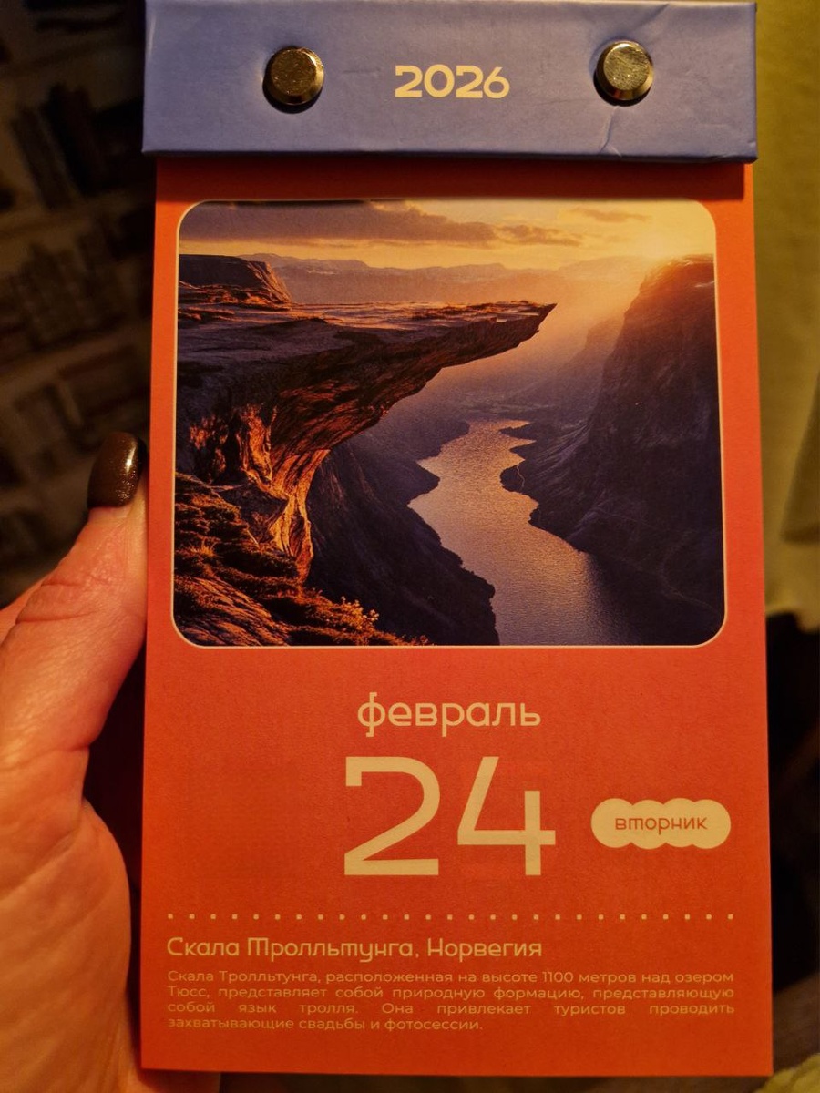 гигантскому языку, высунутому из горного уступа. Формируясь около 10 000 лет назад вследствие таяния древнего ледника, скала приобрела уникальный вид в виде широкого и плоского выступа. Сегодня это известнейший природный символ Норвегии и одна из самых знаменитых пешеходных трасс планеты. Представляет собой внушительную каменную платформу, висящую над зеркальной гладью озера Рингедалсватн на высоте порядка 700 метров. Общая длина платформы около десяти метров и при этом достаточно широкая, чтобы спокойно разместиться на ней и созерцать пейзажи вокруг. Отсюда открывается фантастический обзор на окрестные фьорды, величественные горные массивы и водоемы. Ежегодно сюда стекаются толпы туристов, привлечённые исключительным зрелищем и желанием почувствовать себя частью невероятной природы. Однако достичь скалы непросто: путешествие начинается от деревушки Тюсседал, лежащей вдоль берега фьорда Хардангер. Чтобы оказаться на вершине, предстоит пройти трудный многокилометровый трек длиной пример