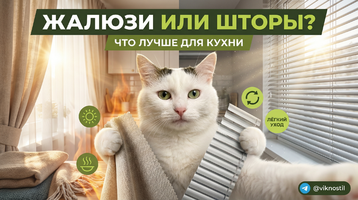 На кухне окно работает так же активно, как плита или мойка. Его открывают для проветривания, закрывают от солнца, используют подоконник для хранения. И именно здесь чаще всего возникает вопрос: жалюзи или шторы — что лучше для кухни. В Крыму этот выбор особенно чувствителен. Солнце активное большую часть года, летом окна нагреваются быстро, а зимой кухня часто становится самым тёплым помещением в доме. Поэтому решение должно учитывать не только внешний вид, но и реальную эксплуатацию. Классические шторы создают ощущение уюта. Даже короткие модели смягчают интерьер и делают кухню «домашней». Они хорошо работают в просторных помещениях, где окно находится в стороне от плиты и рабочей зоны. Но кухня — это пар, запахи, брызги. Ткань впитывает их быстрее, чем кажется. В крымском климате, где проветривание происходит часто, шторы могут выгорать на солнечной стороне уже через пару сезонов. Ещё один момент — пространство. Если подоконник используется активно, длинные шторы начинают мешать. Даж