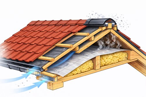 Скатная кровля работает в условиях постоянных температурных перепадов. Зимой нижняя поверхность покрытия нагревается от теплопотерь здания, а наружный слой остается холодным. Летом металлочерепица и профнастил разогреваются до +70 °C, создавая перегрев подкровельного пространства. В обоих случаях внутри конструкции возникает влага: либо из-за диффузии водяного пара из помещений, либо вследствие образования конденсата на внутренней стороне покрытия. Без продуманной системы отвода эта влага накапливается в утеплителе и древесине. Даже при использовании современных мембран и качественного утеплителя проблема не исчезает сама по себе. Пароизоляция не способна обеспечить абсолютную герметичность, а микроподсосы воздуха через стыки неизбежны. Если отсутствует движение воздуха от карниза к коньку, влага задерживается в слоях кровельного пирога, снижает теплотехнические характеристики минеральной ваты и ускоряет коррозию металлических элементов. Основа стабильной работы — непрерывный зазор выс