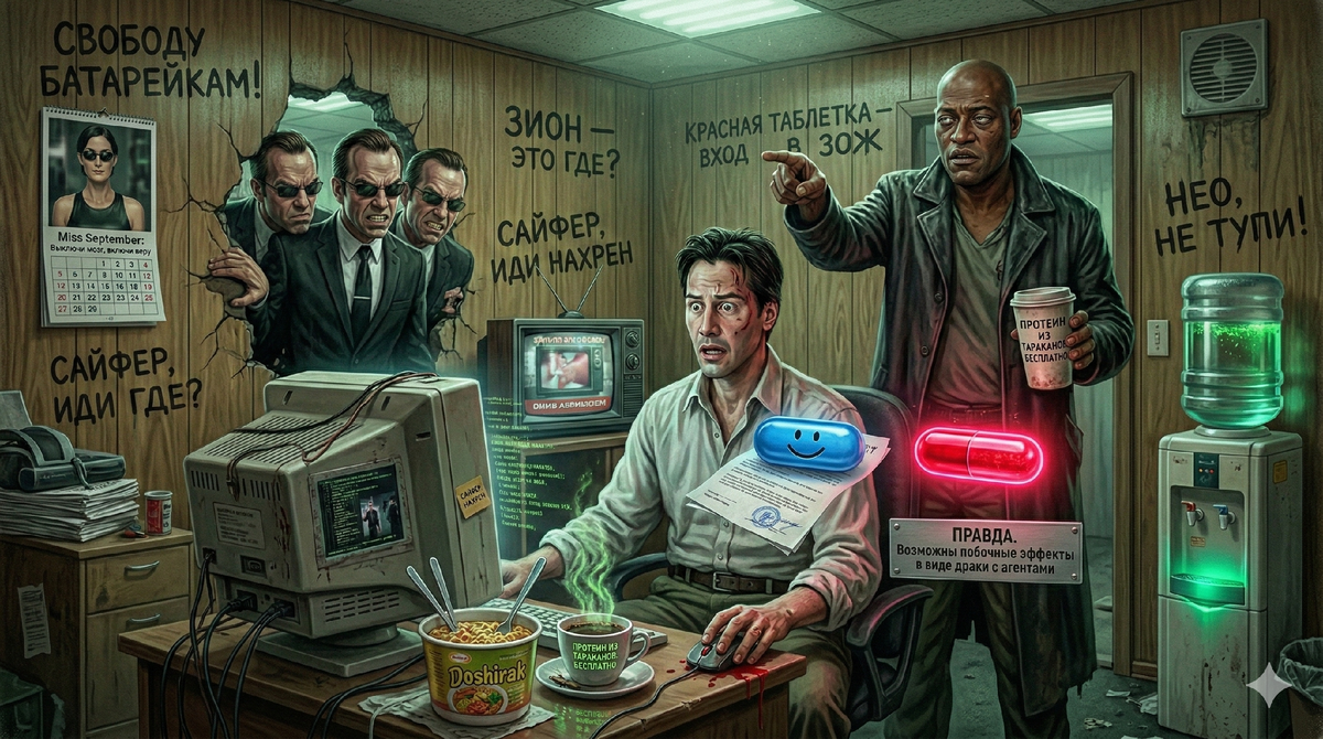 — Именно, — кивает Морфеус. — А этот мир, где ты пил кофе и боялся начальника — это Матрица. Сон, который нам транслируют, чтоб мы не брыкались и вырабатывали электричество спокойно. И только мы, кучка отбитых на всю голову повстанцев, бороздим космос на этом корыте и отключаем людей от системы. Добро пожаловать в Зион — последний город людей. Но мы туда еще долетим, если нас агенты не грохнут.