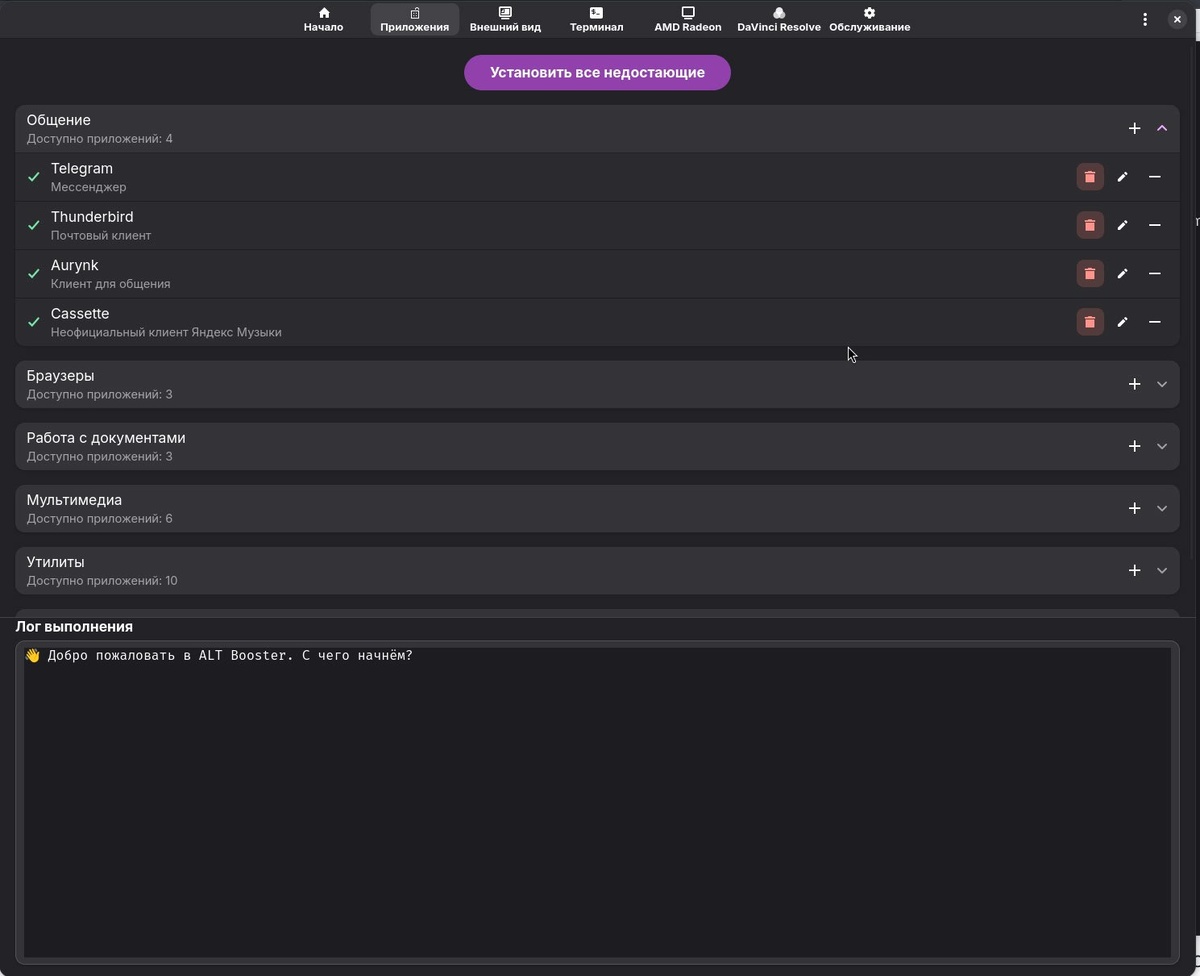 ~ Обновление ALT Booster v5.0-alpha - Переход на модульную систему json - Возможность редактировать список устанавливаемых приложений - Возможность добавлять кастомные скрипты для установки приложений с GitHub # Release v5.0-alpha: Глобальный Data-Driven UI Рефакторинг Масштабное архитектурное обновление в истории ALT Booster. Полностью переработана логика построения пользовательского интерфейса. Теперь большая часть вкладок генерируется динамически на основе JSON-файлов, что делает утилиту невероятно гибкой, модульной и легкой для добавления новых функций. Статистика рефакторинга: `+2640 добавлено`, `-2239 удалено`. Основной файл `ui.py` похудел более чем на 1300 строк! Новая архитектура (Data-Driven UI) Новый универсальный движок `dynamic_page.py`: Добавлен парсер, который на лету читает JSON-схемы и превращает их в нативные компоненты GTK4 / libadwaita. * **JSON-модули**: Хардкод вырезан. Теперь настройки и списки хранятся в удобном декларативном виде в папке `src/modules/`: *