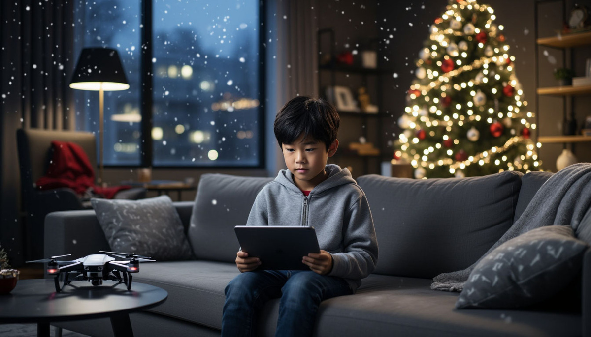 Картинка: Кевин стоит в дверях современного дома с айпадом в руках. На лице — хитрая ухмылка. Около него — дрон (рождественский подарок от родителей). Видно, как здоровенные, замученные мужики запутались в гирляндах.