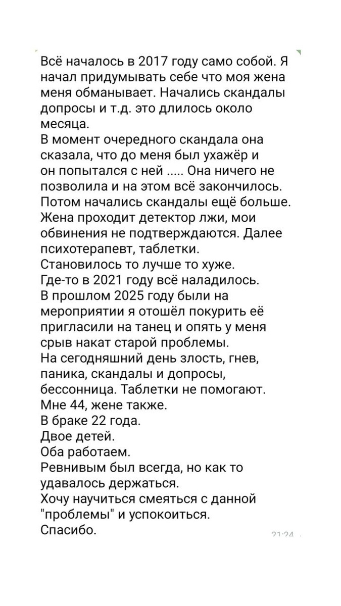 ? Вы честно написали главное: «придумывать себе». Это не совпадение. С точки зрения системной терапии, ваша ревность — это не про жену и даже не про того «ухажёра» 2017 года. Это про внутренний сценарий, который завёл вас в тупик. 🔴 Разберём ваши же слова: 1. «Ревнивым был всегда, но удавалось держаться». Это ключ. Ваша психика всегда была на взводе, но находила баланс. Событие 2017 года (её признание, даже невинное) стало спусковым крючком, который обрушил эту хрупкую систему. Проблема была не в её словах, а в вашей готовой взрывной схеме. 2. «Детектор лжи не подтверждает, таблетки не помогают». Вы ищете подтверждение вовне, но проблема внутри. Факты не работают, потому что вами управляет не логика, а древний, глубинный страх быть униженным, покинутым, недостаточно ценным. Этот страх сильнее любых доказательств. 3. «Срыв на мероприятии из-за танца». Это доказывает, что причина не в жене. Танец — лишь триггер, который запустил старый системный паттерн: угроза — паника — контроль (с