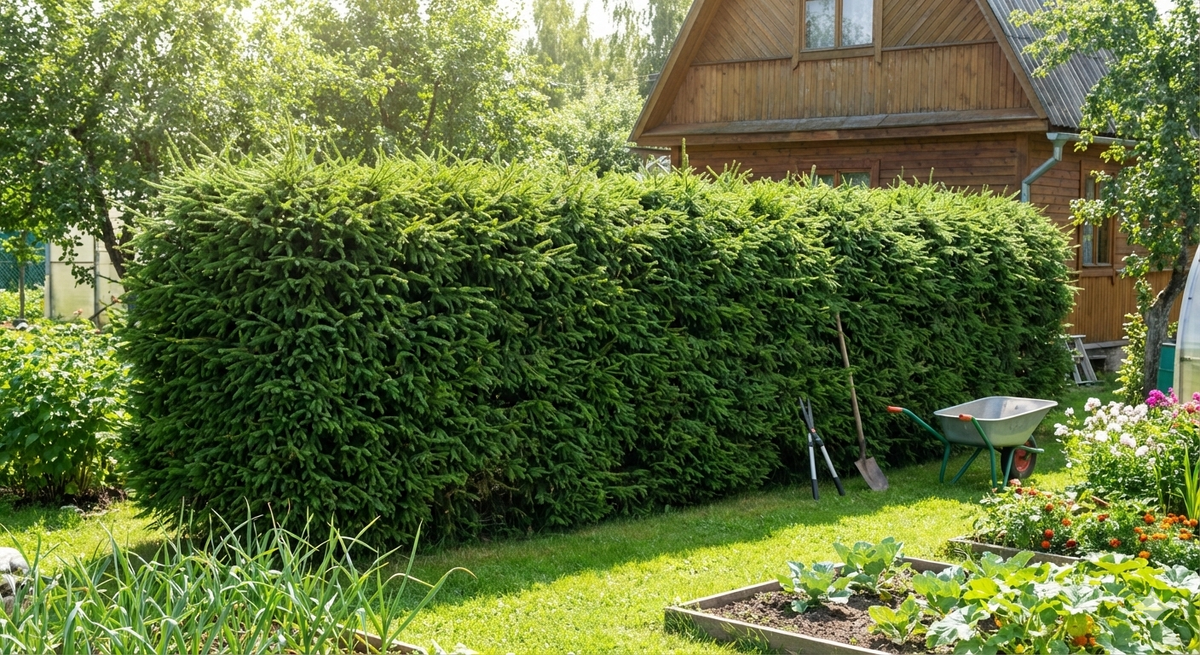 - Захват территории: Живая изгородь занимает больше места в ширину, чем обычный забор. Корневая система елей мощная и поверхностная — она будет забирать влагу и питательные вещества у соседних посадок (грядки и цветники придется отодвинуть на пару метров).