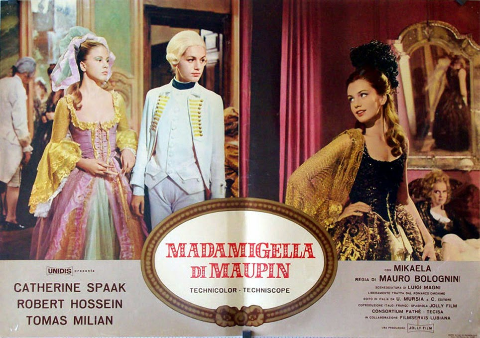 "В сезоне 1964/1965 годов на европейские экраны вышла костюмная картина Бернара Бордери «Анжелика – маркиза ангелов». Её кассовый успех был впечатляющим: 5,4 млн. зрителей в Италии, 5,5 млн. зрителей в ФРГ и 3 млн. зрителей во Франции. Понятно, что продюсеры четырех стран (Италия, Испании, Франция и Югославии) мечтали о том, чтобы приключенческая лента «Мадмуазель де Мопен» добилась такого же успеха у публики...". Мадемуазель де Мопен / Madamigella di Maupin / Mademoiselle de Maupin. Италия-Испания-Франция-Югославия, 1965. Режиссер Мауро Болоньини. Сценаристы: Хосе Гутьеррес Маэссо, Луиджи Маньи (по одноименному произведению Теофиля Готье). Актеры: Катрин Спаак, Робер Оссейн, Томас Милиан, Микаела, Анхель Альварес, Оттавия Пикколо и др. Мелодрама. Приключения. Премьера: 8.01.1966. Прокат во Франции: 0,4 млн. зрителей. Прокат в Испании: 0,4 млн. зрителей. XVIII век. Мадмуазель де Мопен ждет множество приключений, в том числе и на любовном фронте… В год выхода этой ленты в прокат пресса