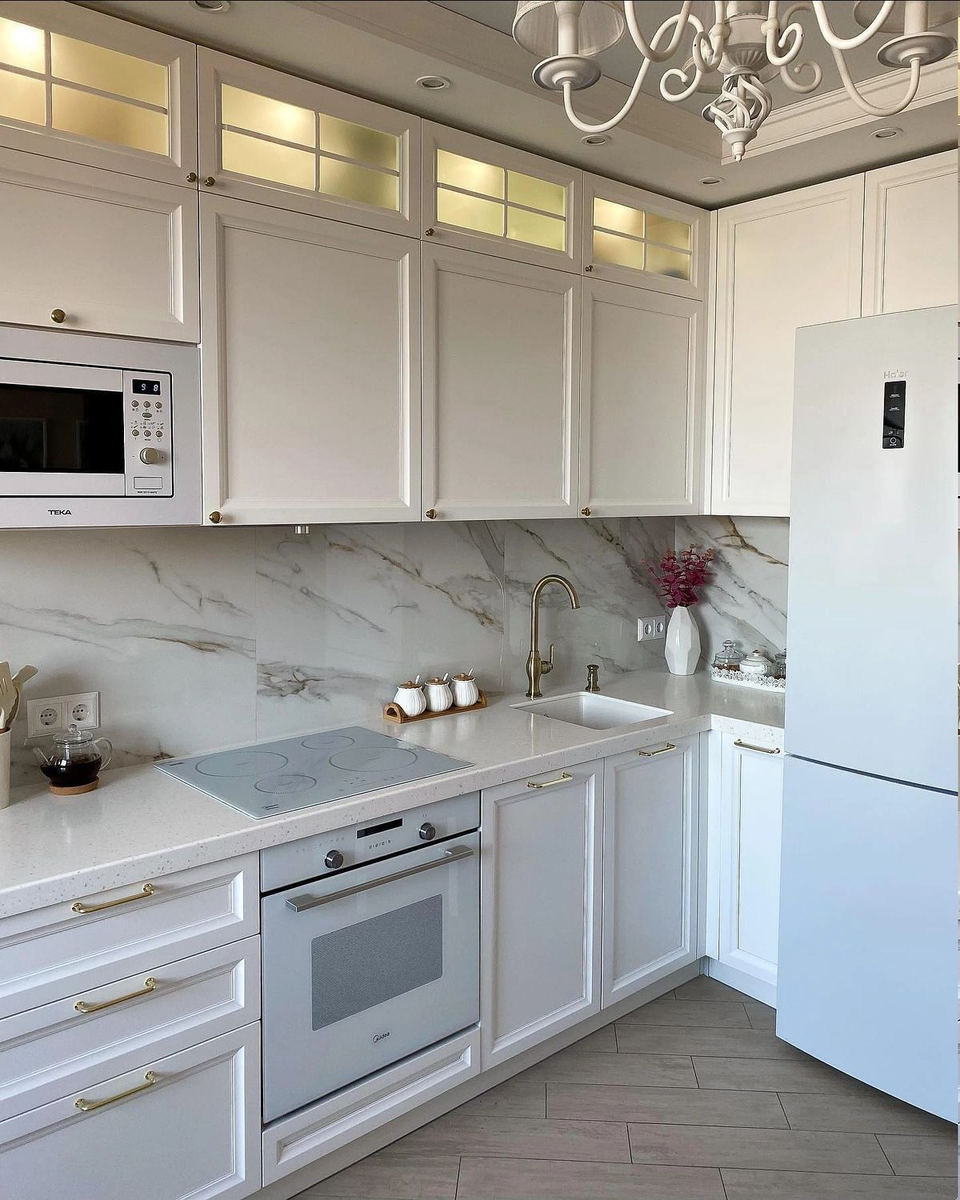 В адаптированной версии для небольшой кухни ар-деко работает через выразительные, но контролируемые акценты: ритмичные фасады, латунные детали, контраст камня и глянца. При грамотной реализации интерьер приобретает статусность и театральную глубину, не теряя функциональности.