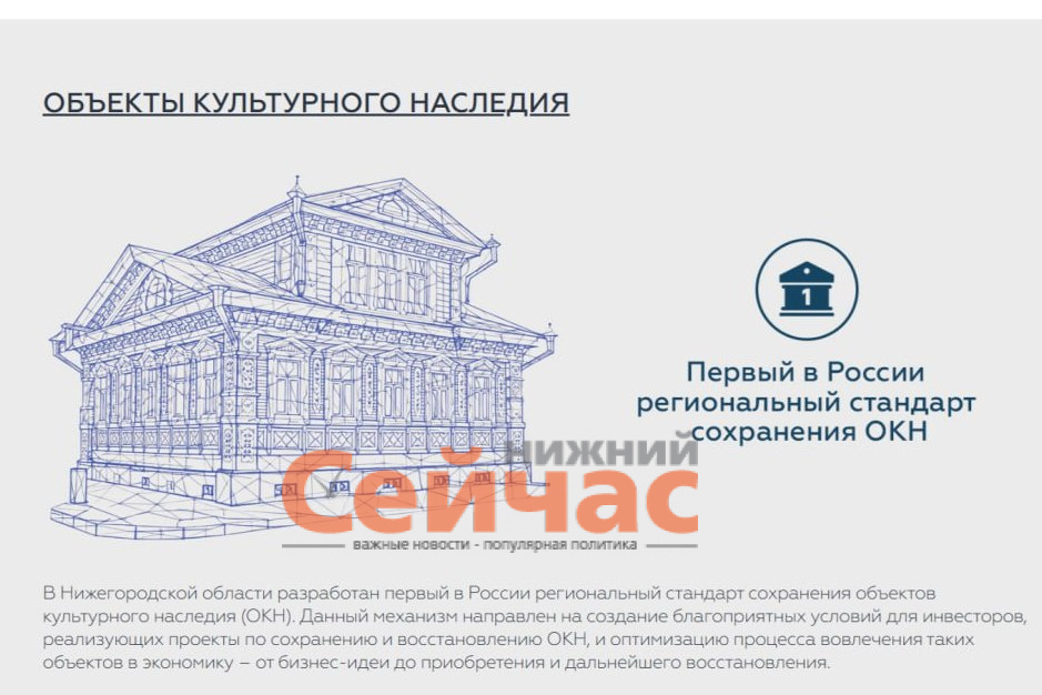 На инвестиционном портале Нижегородской области создан специальный раздел, посвященный проектам по сохранению объектов культурного наследия (ОКН). Об этом сообщили в Корпорации развития Нижегородской области. На портале заработала «Витрина проектов ОКН», где представлены объекты, доступные для вложения средств и дальнейшего коммерческого использования. Сейчас в ней размещена информация о 39 объектах в 15 муниципалитетах. Предприниматели также могут оставить заявку на реализацию конкретного проекта через форму «Стать инвестором». Для инвесторов предусмотрены различные меры поддержки. Это субсидии и налоговые льготы, льготное кредитование, а также аренда объекта и земельного участка под ним за один рубль. Работа по улучшению инвестиционного климата ведется в рамках нацпроекта «Эффективная и конкурентная экономика». Напомним, обновлен порядок выплат Центру поддержки предпринимательства Нижнего.