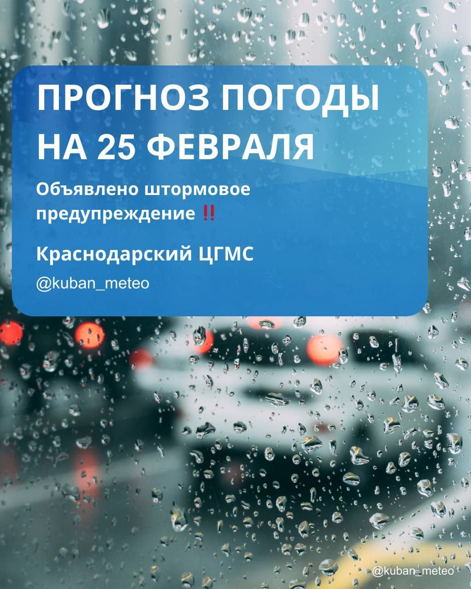 ☁️⛅⛈️ 🌧️ Среда, 25 февраля ‼️ Объявлено штормовое предупреждение ‼️ 📍 Краснодарский край Облачно. Временами дождь, утром и днём местами сильный; в горах снег. Утром и днём в отдельных районах сильный дождь, ливень в сочетании с грозой и сильным ветром с порывами 20 м/с (КМЯ). Ночью местами туман. 💨 Ветер южный, юго-восточный 5–10 м/с, местами порывы 12–14 м/с, в отдельных районах 15–18 м/с. 🌡 Температура воздуха: ночью 0…+5°; днём 8…13°, местами в северной половине края 2…7°; 🏔 в горах ночью -3…-8°, днём -4…+1°; на Черноморском побережье ночью 3…8°, днём 6…11°. 📍 По г. Краснодару Облачно. Временами дождь. 💨 Ветер южный 5–10 м/с, днём порывы 12–14 м/с. 🌡 Температура воздуха ночью 3…5°, днём 8…10°. ⚠️ Будьте внимательны и осторожны! С заботой, Краснодарский ЦГМС @kuban_meteo 💙