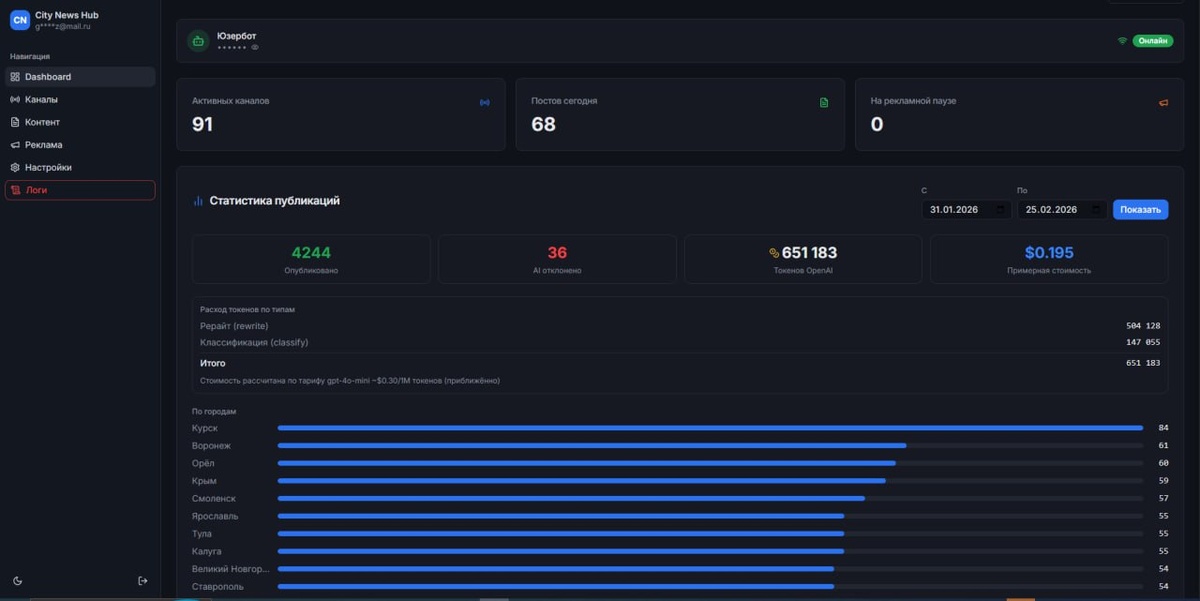👆 Сбор новостей с закрытых каналов - online 🗒 Рерайт + замена подписей на свои 👮♀️ Фильтрация и блокировка рекламных постов ————- ✅ Админка со статистикой, добавление источников и куда публиковать. ✅ Онлайн редактирование, закреп, удаление публикаций. ✅ Подсчет потраченных токенов и примерная сумма. ✅ Рекламный кабинет с планером. ———- Можно использовать не только под новости городов. Принцип работы: Источник ▶️ Фильтрация ▶️ Рерайт ▶️ Публикация в ваш канал 🚀 Моментальный сбор после публикации на канале доноре. Что быстрее и точнее обычной RSS. 🔐 Сбор с закрытых каналов. ———— 🆓 Установка под ключ 🆓 Всё на вашем сервере с доменом 🆓 Доступ по логину / паролю 🆓 Обновления нажатием на 1 кнопку 🗳 Стоимость содержания от 210 р/мес (сервер) + OpenAi от 5$ 💰 Стоимость 15к без абонентских плат Заказывай установку 👉 @websansay #citynewshub