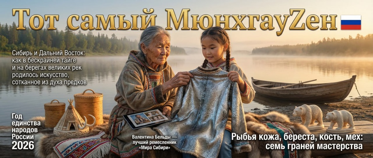 🚨 Рубрика: «Исторический калейдоскоп» Цикл: «Ремесла народов России: от щепы до цифры» 📅 Сибирь и Дальний Восток: как в бескрайней тайге и на берегах великих рек родилось искусство, сотканное из духа предков 🎭 Образ от МюнхгауZена: Представьте себе берег Амура ранним утром. Туман стелется над водой, пахнет рыбой и тайгой. В стойбище нанайцев просыпается жизнь. Старая мастерица садится у входа в жилище и достаёт связку рыбьих шкур — каждая выделана её руками, каждая пахнет дымом и рекой. Рядом внучка, приехавшая на каникулы из Хабаровска, показывает на планшете фотографии с выставки в Москве, где работы её бабушки висят рядом с якутскими чоронами и тувинскими фигурками. Бабушка смотрит и качает головой: «Неужели там, за тысячи вёрст, кому-то нужно то, что мы делаем здесь, в тайге?» А внучка смеётся: «Нужно, ба. Там сейчас это называют культурным кодом». И солнце встаёт над Амуром, золотя рыбью кожу, которая через месяц отправится в Москву, чтобы рассказать всей стране о том, как жи