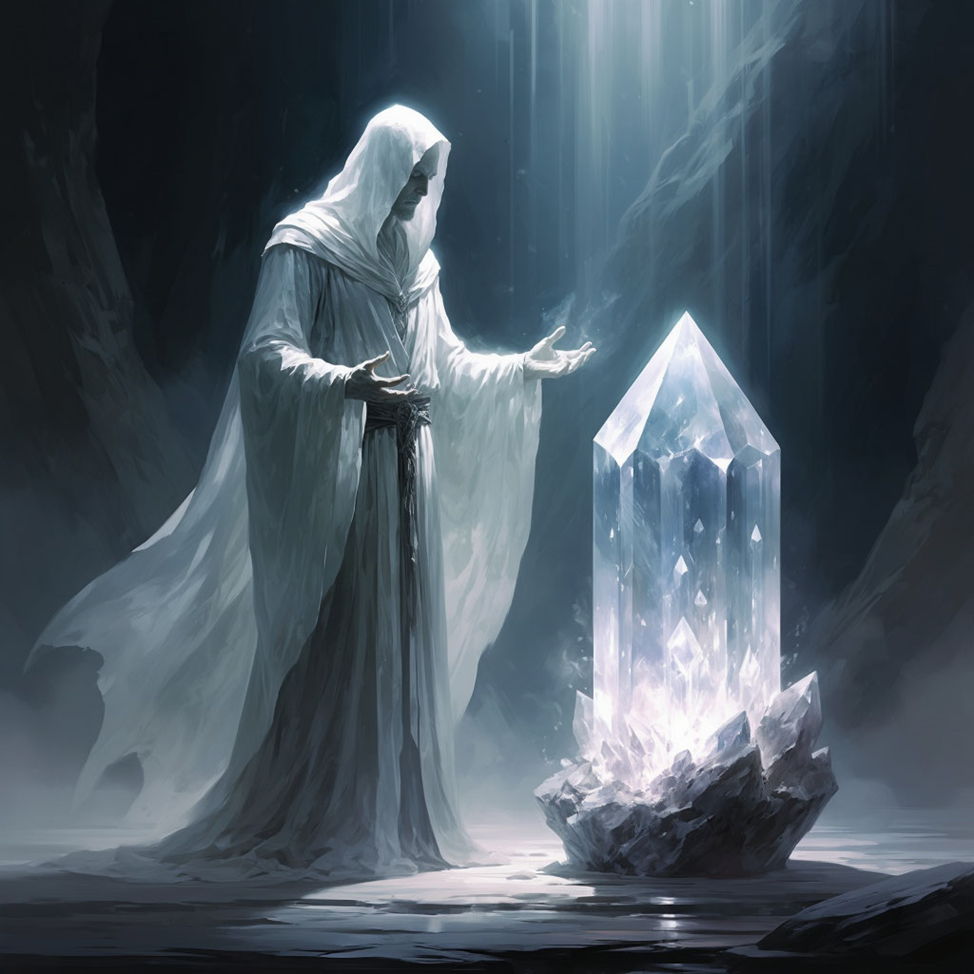 Собрав воедино свои наблюдения, они начали медленно произносить слова, которые всплывали в их сознании. Кристалл вспыхнул ярче, а затем из него полился поток света, окутывая Лизу и Максима. Когда свет рассеялся, они увидели перед собой призрачную фигуру — это был великий мастер.