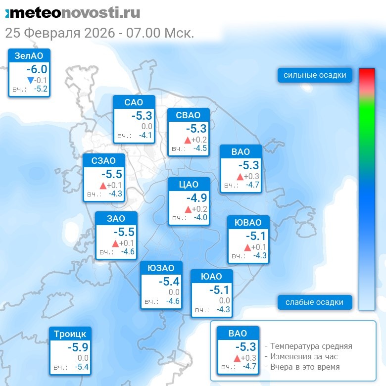 В 7:00 в Москве было от -6.2°C до -4.4°C, средняя температура -5.3°C #погода #Москва #зима #температура #25февраля #среда