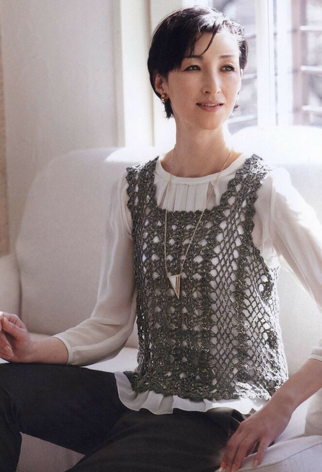 Вяжется эта вещь крючком ажурным узором с сеточкой снизу-вверх как раз показывает,что сочетаются такие вещи с различными видами одежды. Этот вариант жилета в сочетании с рубашкой. Схемы для этой модели я искала давно и предлагается разным