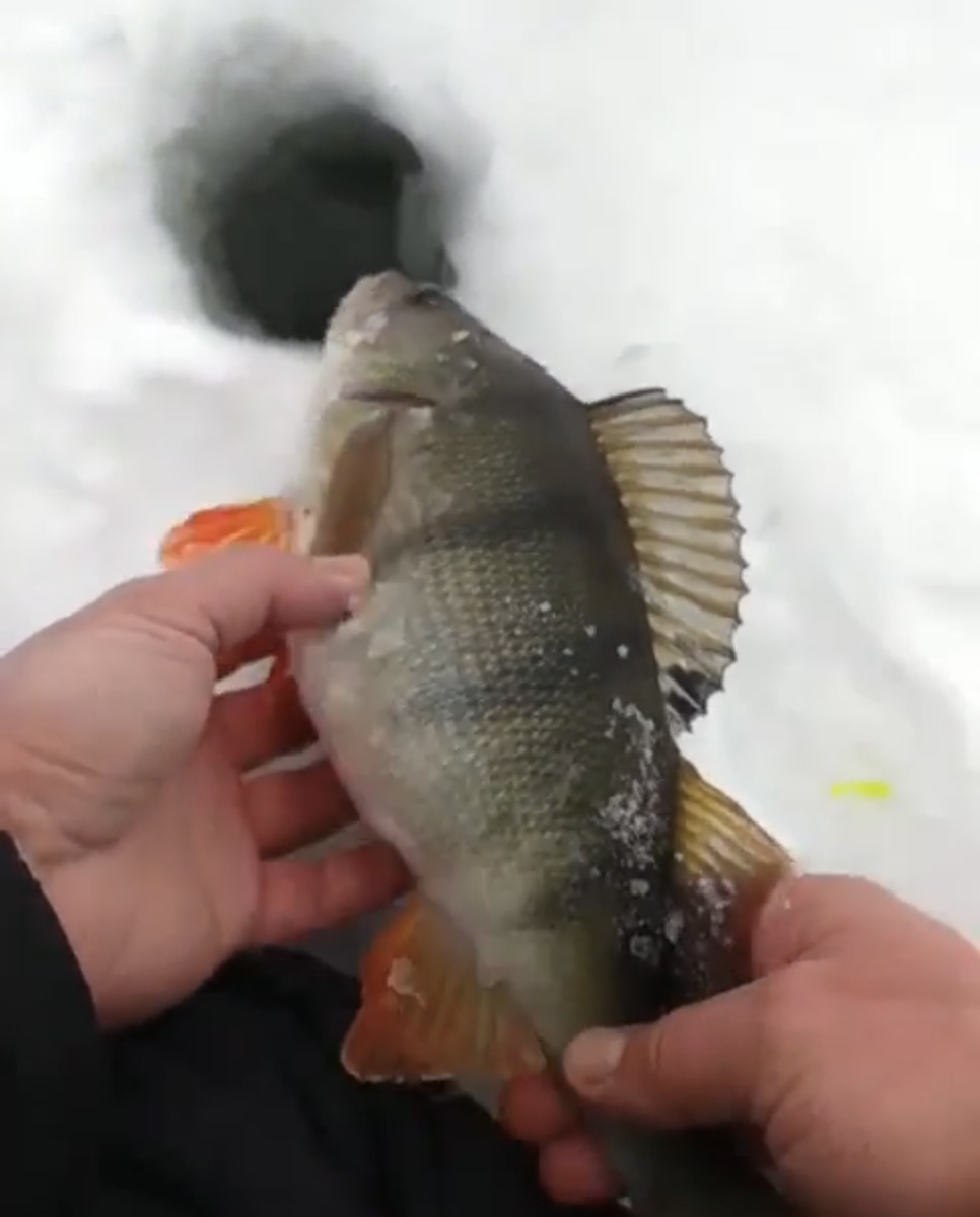 Поняв что проспал утренний клев, я двинул к берегу, переждать и заодно исследовать новые точки. Мелкий окунь поклевывал и время прошло незаметно. На часах уже 13:30, пасмурно, дует южный но холодный ветер, заметая лунку снежком. Быстро возвращаюсь к лунке, которую отметил палочкой, забрасываю полярис 25 мм, несколько подбросов, удар и досадный обрыв. Решаю как и вчера половить на дагера 40 мм с леской 0,15 мм. Поклека, мелкий оголтелый окунь с широко раскрытой пастью, которая не закрылась, даже когда я это попытался сделать пальцем. В таком состоянии он и был отпущен восвояси. Еще 5 минут ловли, поклевок нет. Перевязываю, пока есть время, деликатную снасть, но ставлю кеглю кислотного цвета 20 мм, рассудив что погода пасмурная и яркая приманка будет лучше видна в темноте и не ошибся. Время около 14:00. Три подброса, удар и кто-то тяжелый, нехотя подался в сторону лунки. Фрикцион ослаблен, до лунки полтора метра и видимо увидев свет рыба начинает тянуть ко дну. Утаскивает всю леску до удочки и останавливается. Снова пытаюсь поднять, около полутора метров рыба поддается и снова утаскивает приманку с леской на дно. С третьей попытки удалось ее подтянуть к лунке и завести. Дальше дело техники. Я был в шоке когда увидел в лунке морду этой окунихи.