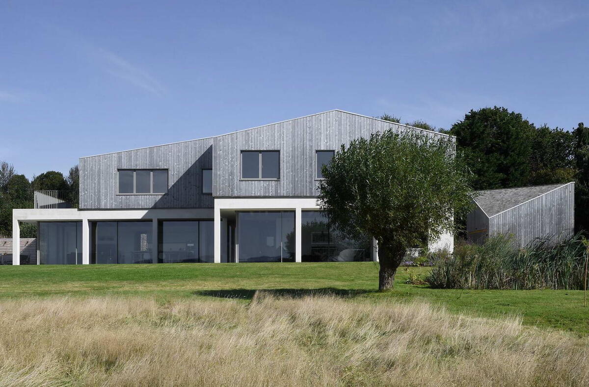 Этот новый семейный дом, выполненный из натуральных материалов — камня и древесины, заменил старое жилище и несколько разрушенных сельскохозяйственных построек на участке. Проект предусматривал создание просторного дома с четырьмя спальнями и открытыми жилыми зонами, которые максимально используют панорамные виды на холмы Саут-Даунс. «Дом у поля» спроектирован так, чтобы гармонировать с окружающим ландшафтом. На первом этаже находятся гостиная, кухня-столовая и вспомогательные помещения, а большие окна обеспечивают связь с природой. Дом использует естественное освещение и тепло: зимнее солнце проникает через южное и западное остекление, а летом нависающий этаж защищает от перегрева. Северный и восточный фасады выполнены из изолированной древесины и известняка, что сохраняет тепло. Центральным элементом дома является лестница из цельного известняка, окружённая натуральными материалами — пихтой Дугласа и еловыми CLT-панелями. Верхний этаж и крыша выполнены из CLT, облицованного кедром,