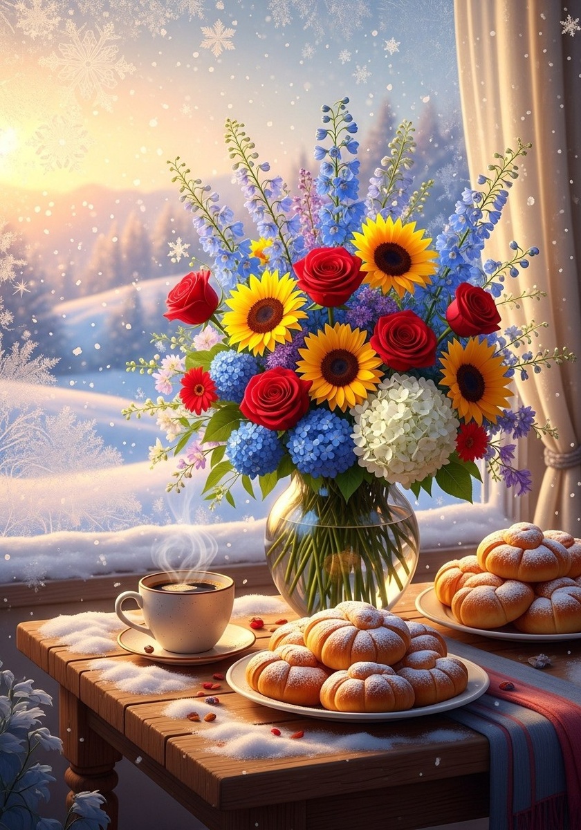 Пусть это утро подарит тебе нежное тепло в сердце, словно мягкий плед, и заряд бодрости на весь день. Пусть каждая снежинка принесет радость и вдохновение. ☀️.