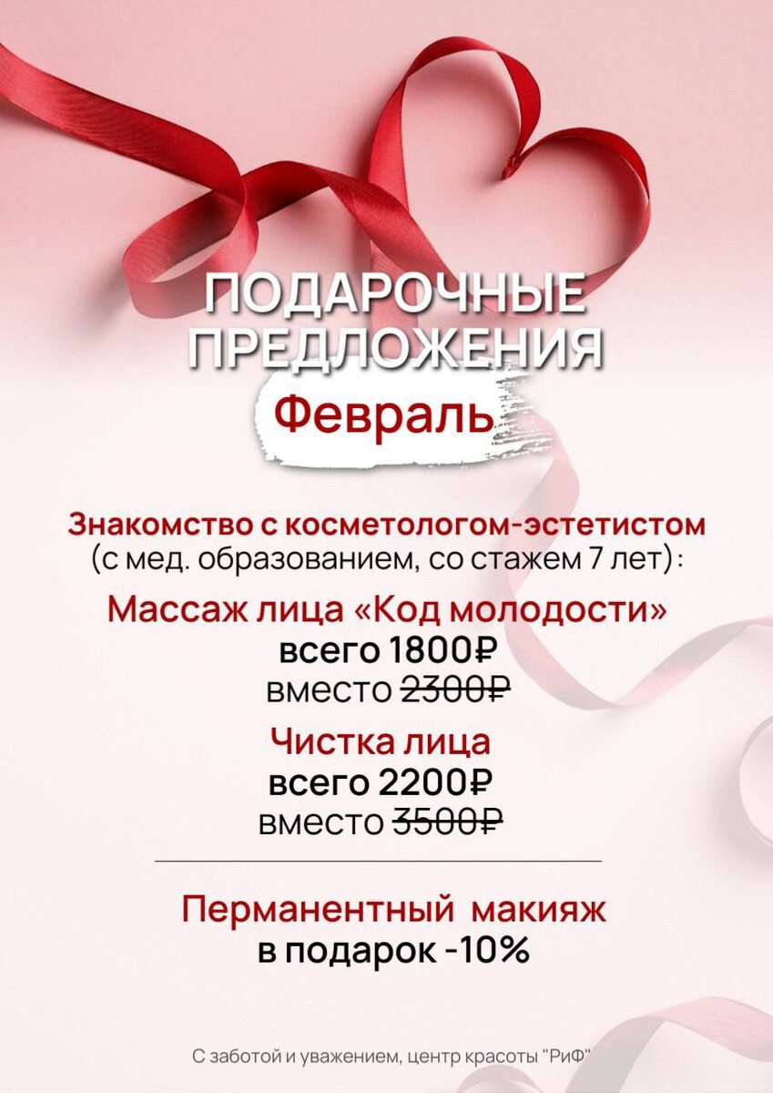 Успейте записаться в феврале на март по приятным ценам. ____ Центр красоты «Риф» Забота о здоровье и красоте доступна! * Запись/консультация: 8 (4234) 32-10-47 Пишите нам в мессенджеры🫶🏻 ✅ WhatsApp ✅ Телеграм ✅ МАХ Больше информации в наших соц сетях: В Контакте ⭐️ Одноклассники Дзен Сайт: https://rif-uss.ru/