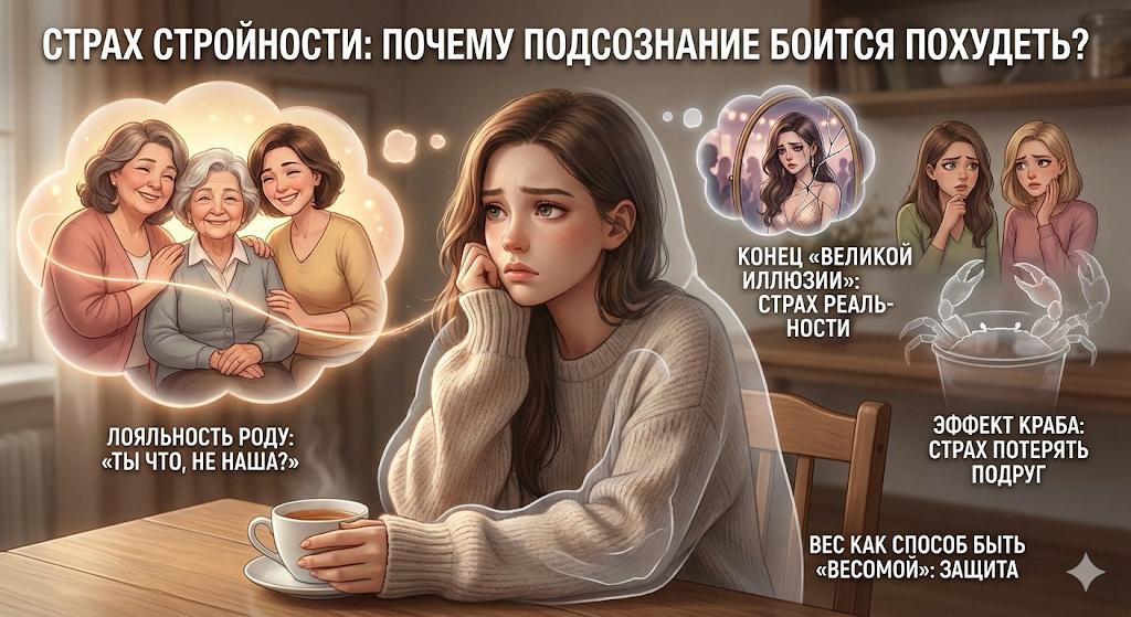 Мы привыкли думать, что стройность — это сплошные бонусы: здоровье, красивая одежда, уверенность. Кажется, ну кто может бояться стать лучше? Но правда в том, что многие из нас годами буксуют на месте, потому что подсознательно боятся похудеть.Вес — это не просто жир. Это социальный щит, способ выживания и даже способ чувствовать себя «своей». Давайте разберем, что же такого ценного мы боимся потерять вместе с лишними килограммами. 1. Лояльность роду: «Ты что, не наша?» В системной психологии есть понятие «родовой лояльности». Представьте семью, где бабушка, мама и тетя — женщины «статные», крупные. В этой семье полнота — признак здоровья, достатка и принадлежности к клану. Если вы решите стать стройной, ваше подсознание может прошептать: «Если я стану тонкой, я стану чужой. Я буду выглядеть как предательница, которая отрицает свою породу». Стать стройной в такой семье — значит заявить: «Я не такая, как вы». А это страшно, потому что базовый инстинкт велит нам быть «в стае», чтобы выжит