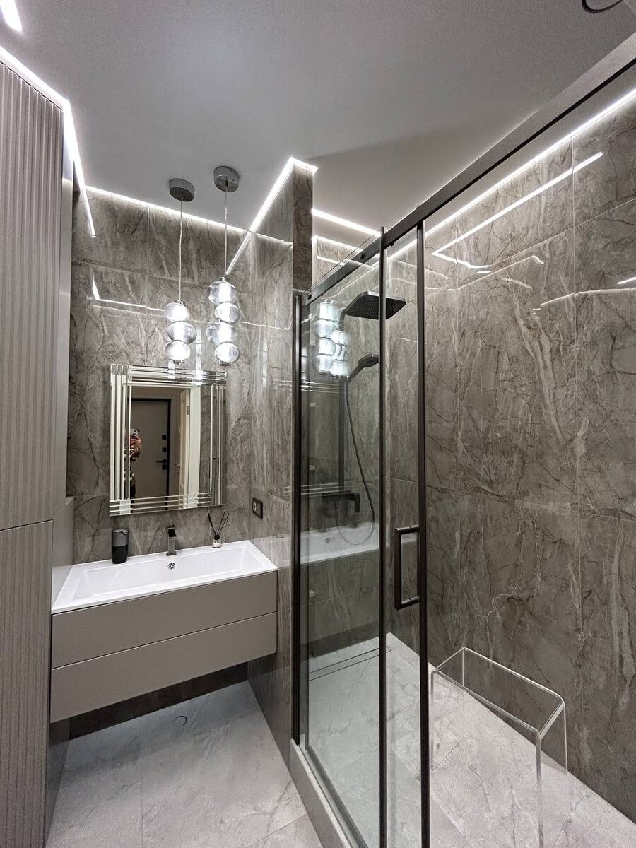 Установили мебель в ванную на Пахтусова, 2 по проекту Юлии Дунаевой Красивый рендер от дизайнера интерьера — это только половина пути. Вторая, не менее важная часть — найти тех, кто сможет технически грамотно воплотить задумку в жизнь, не испортив идею кривыми стыками или дешевой фурнитурой. Команда «Академии Мебели» часто работает со сложными дизайнерскими решениями. Недавно мы завершили проект в Архангельске — изготовили и установили мебель для квартиры по проекту дизайнера интерьера Юлии Дунаевой. Начнем с ванной комнаты. Здесь перед нами стояла задача сделать не просто влагостойкие шкафчики, а создать цельную архитектуру пространства с нестандартной геометрией и сложными фактурами. В качестве основного оттенка для мебели был выбран светло-серый с мягким бежевым подтоном. Это очень спокойный, обволакивающий цвет. Он не уходит в холодный промышленный бетон, добавляет санузлу тепла и при этом выглядит гораздо благороднее привычного белого глянца. Центральный элемент — подвесная тумба
