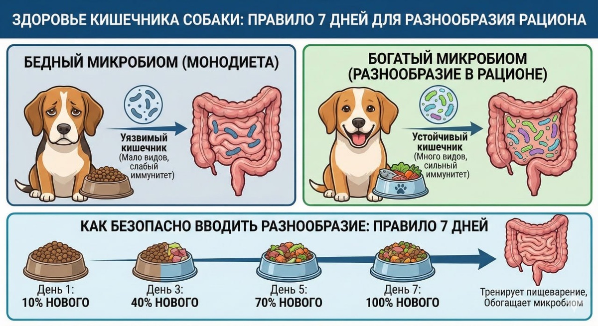 Годами реклама коммерческих кормов внушала нам строгое правило: выберите одну марку и не меняйте её никогда. Нам говорили, что собачий желудок слишком нежный для разнообразия. Однако современные ветеринарные исследования доказывают: этот подход в корне неверен и медленно разрушает здоровье вашего питомца. Ежедневный вопрос: «Правда ли, что собаку нужно всю жизнь кормить одним и тем же кормом, чтобы не сорвать ей желудок?» Годами реклама коммерческих кормов внушала нам строгое правило: выберите одну марку и не меняйте её никогда. Нам говорили, что собачий желудок слишком нежный для разнообразия. Однако современные ветеринарные исследования доказывают: этот подход в корне неверен и медленно разрушает здоровье вашего питомца. (В конце этой статьи мы дадим точный, научно доказанный протокол того, КАК именно нужно вводить новые продукты, чтобы тренировать пищеварение без риска диареи). Эффект «ленивого кишечника» Кишечник собаки — это дом для триллионов полезных бактерий (микробиома), котор