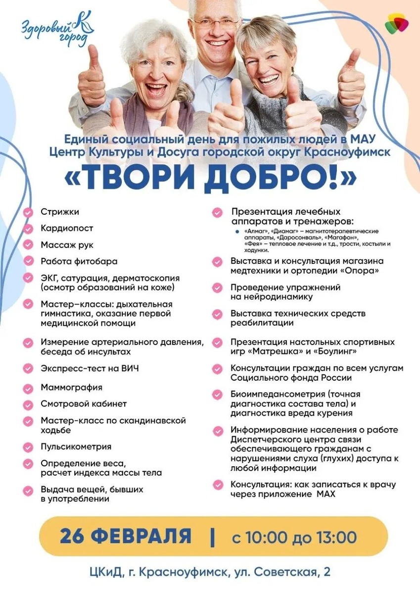 Единый социальный день давно уже стал доброй традицией Центра Культуры и Досуга и его партнеров — с тех самых пор, как был организован Натальей Ахмальевой. Два раза в год в рамках этого мероприятия все люди пенсионного возраста или имеющие проблемы со здоровьем могут прийти в ЦКиД, чтобы получить различные услуги и консультации, а сам Центр превращается в настоящую территорию заботы, добра и хорошего настроения. В этом году единый социальный день состоится 26 февраля. С 10.00 до 13.00 здесь можно совершенно бесплатно проверить здоровье, получить консультации лучших специалистов и полезные навыки. В программе: — бесплатные стрижки; — работа кардиопоста, — определение показателей здоровья артериального и глазного давления, веса, индекса массы тела, сатурации; — пульсометрия; — ЭКГ; — экспресс-тест на ВИЧ, — дерматоскопия — осмотр образований на коже (пятна, родинки, бородавки) с целью выявления меланомы; — биоимпедансометрия — точная диагностика состава тела и вреда курения за 3 минуты;