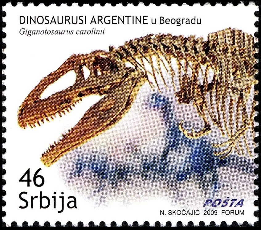Как всегда, в начале недели мы приготовили для вас свежий выпуск палеонтологической рубрики. Сегодня мы хотим показать вам кое-что из нашей почты. Вот такую марку с динозавром мы недавно получили из Сербии. Сербия – небольшая страна, и ни о каких находках динозавров оттуда мы не слышали (главным образом потому, что в мезозойскую эру территория современной Сербии в основном находилась под водой). Поэтому, вооружившись лупой, принялись разглядывать марку еще пристальнее. Выяснилось, что это динозавр из Патагонии (местность на юге Аргентины), а марки были выпущены специально к выставке «Динозавры Аргентины в Белграде» в 2009 году. Всего на той выставке были представлены двадцать видов южноафриканских динозавров, но на марки попали не все из них. На той, что получили мы, изображен скелет гиганотозавра (Giganotosaurus carolini) – крупного хищника мелового периода, аналога североамериканского тираннозавра. На второй марке представлена реконструкция внешнего вида
