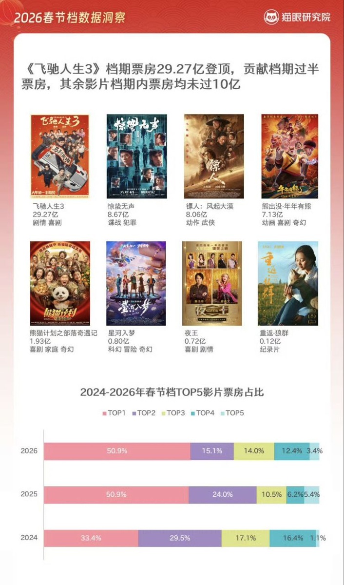 Официально завершился кинопрокатный сезон, приуроченный к празднованию Весеннего фестиваля 2026 года. Согласно данным, опубликованным Государственным управлением кинематографии 24 февраля, общие кассовые сборы за этот период (с 15 по 23 февраля) достигли 5,752 млрд юаней, а количество зрителей составило 120 миллионов человек. Восьмой год подряд число посетителей кинотеатров превышает 100 миллионов, а общее количество сеансов установило новый рекорд за всю историю кинопоказа в праздничные даты. Столь уверенные показатели заложили прочный фундамент для развития китайского кинорынка в текущем году. Праздничный репертуар отличался богатством и разнообразием жанров. На экраны вышли такие громкие новинки, как «Пегас 3», «Затишье перед бурей», «Клинки стражей: Пустыня», «Медведи-соседи» и «Приключение Панды: Волшебное племя». Зрителям были представлены комедии, шпионские триллеры, фильмы о боевых искусствах, анимация и научная фантастика, что позволило удовлетворить запросы аудитории всех воз
