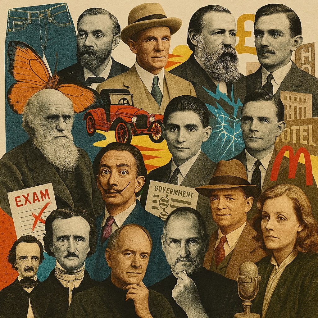 Леви Страусс, основатель компании Levi’s, создал одежду, ставшую символом XX века, но сам никогда не носил джинсов, считая их рабочей формой, не подходящей человеку его статуса. Альфред Нобель, чьё имя сегодня связано с премией мира, заработал своё состояние на производстве динамита и других взрывчатых веществ, а идею премии сформировал после того, как прочитал собственный ошибочный некролог под заголовком «Торговец смертью умер». Генри Форд, человек, изменивший автомобильную индустрию, не умел водить машину и предпочитал, чтобы его возили, считая управление автомобилем делом водителей, а не промышленников. Фридрих Энгельс, идеолог рабочего движения, всю жизнь жил на доходы от фабрики, принадлежавшей его семье, и фактически был капиталистом, финансировавшим антикапиталистическую теорию. Чарльз Дарвин, автор теории естественного отбора, после экспедиции на «Бигле» почти не путешествовал, страдал тяжёлыми психосоматическими расстройствами и большую часть жизни провёл в уединении. Франц К