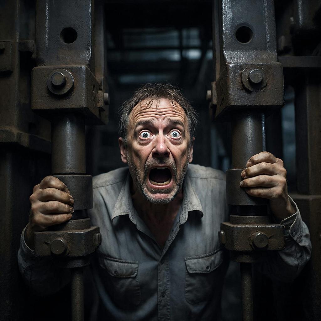 Но было поздно. Он рванулся назад, но ботинок, стоявший на скользкой от масла плите внутри ограждения, безнадёжно заскользил. Он взмахнул руками, пытаясь удержать равновесие, и в этот момент его куртка зацепилась за выступающий угол металлической ленты. Рывок — и он оказался в самой ловушке.