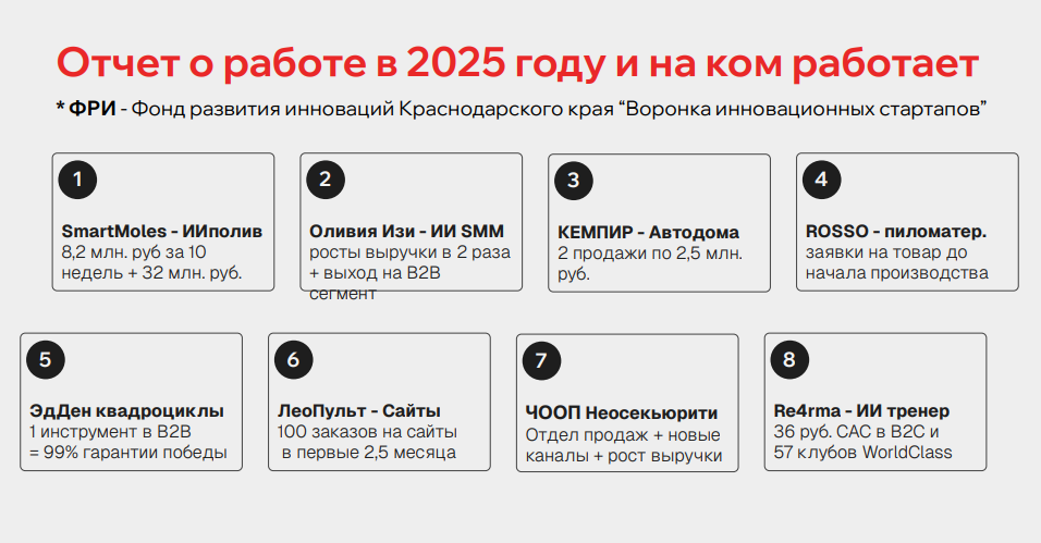 Работы с Фондом развития инноваций (я там сертифицированный трекер и сотрудничаю в рамках «Воронки инновационных стартапов»).