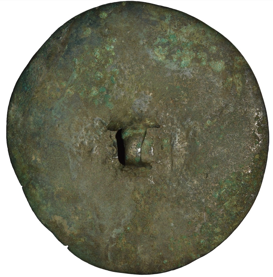 Это был не просто изящный аксессуар. Перед нами массивный бронзовый диск, слегка неровной, живой формы. У него нет бортика — его поверхность открыта пространству, словно застывшее озеро, не имеющее берегов. На оборотной стороне, в самом центре, расположена петля, выполненная из тонкой, но широкой пластины.