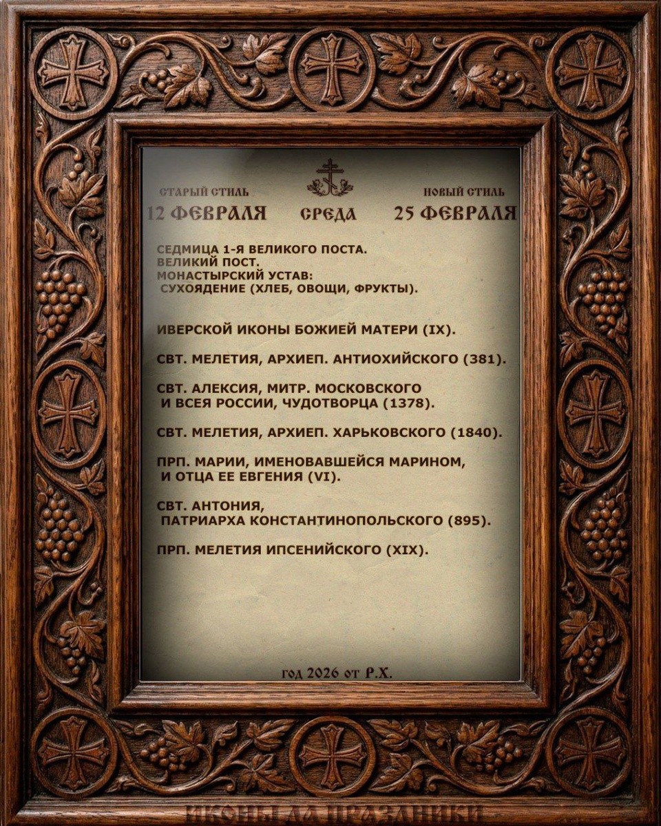 25 февраля 2026 Седмица 1-я Великого поста. Великий пост. Монастырский устав: cухоядение (хлеб, овощи, фрукты). 🇦🇺🇦🇼🇦🇽🇦🇿🇧🇦🇧🇧🇧🇩🇧🇪 🕯️Иверской иконы Божией Матери (IX).
