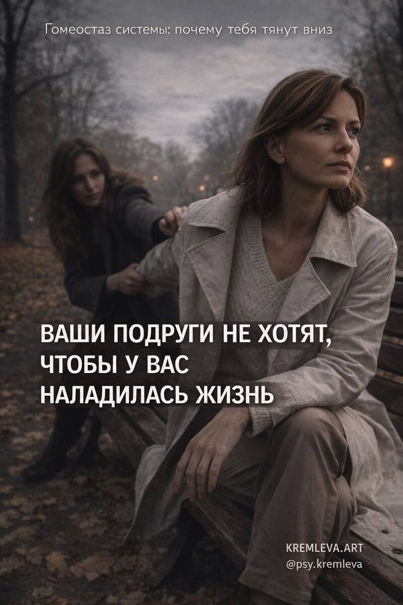 В психологии есть понятие «гомеостаз системы». Если вы растете (доход, самооценка, счастье), а подруга остается на месте — система начинает вас стаскивать обратно, чтобы сохранить баланс. Она не специально. Просто ей страшно. Если вы смогли, значит и ей надо, а она не готова. Легче обесценить: — «Что-то ты похудела/поправилась» (читай: стала другой). — «Тебе просто повезло». — «Опять с каким то неудачником связалась». — «Раньше ты была проще/добрее/веселее». Проверьте круг общения сегодня. Выпишите 5 человек, с кем общаетесь чаще всего. Оцените от 1 до 10: как вы себя чувствуете после встречи с каждой? Прилив энергии или упадок и опустошение? У кого есть такие подруги, после которых «как выжатый лимон»? Делитесь в комментариях. 👇